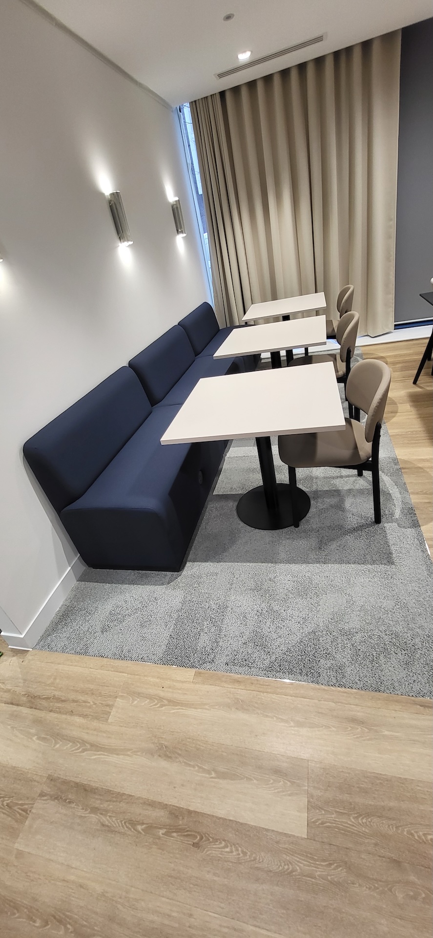 The areas for LVT installation required careful preparation. Firstly, the existing concrete subfloor was thoroughly cleaned, after which our team applied a specialist smoothing compound to achieve a fine surface for ready for the LVT planks to be installed through the corridor and refreshment points – and to achieve the best transition between the carpet and LVT.