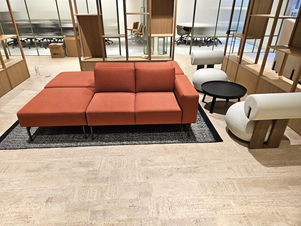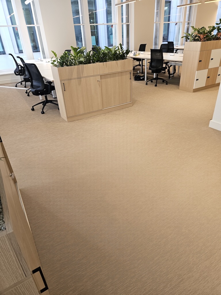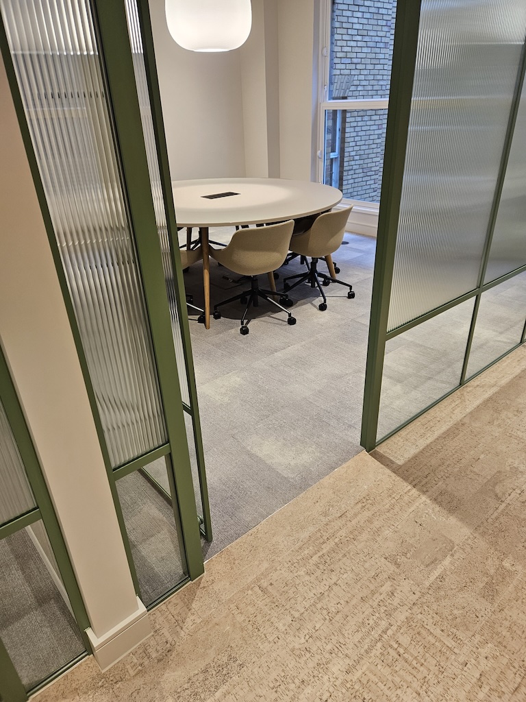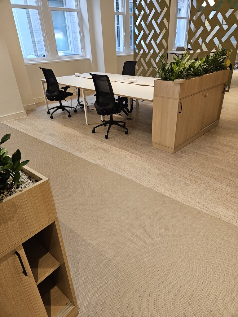 The main area was open plan and we used a combination of Cork and Woven Vinyl tiles of the highest quality to achieve the designer’s vision. For the office areas, Northern Soul carpet tiles were specified, designed for heavy commercial use (with a 70% recycled content and with Cradle to Gate footprint 100% off set)